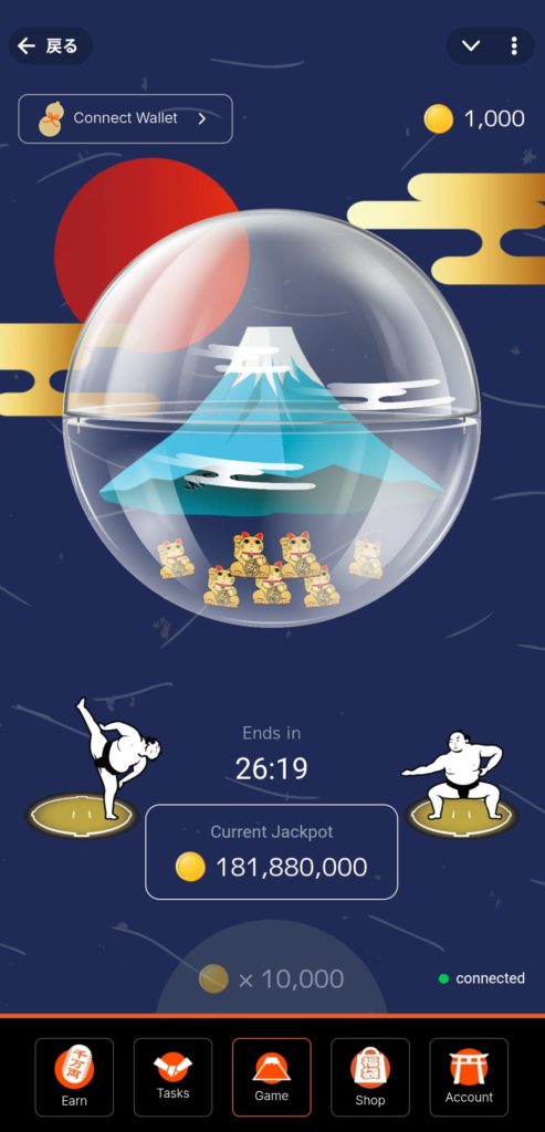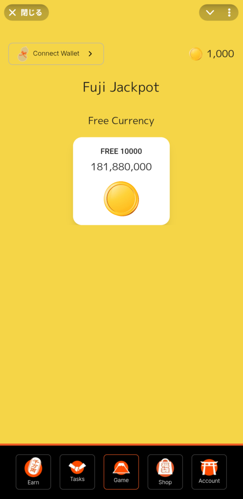 「FUJIYAMA TAP」のGame機能の一つとして、2026年1月1日にテストローンチされたJackpotゲームです。1回10,000Coinsで参加できます。JackpotにCoinsを投入すると30分間(初回のみ30分)10分間のカウントダウンが開始されます。カウントダウンがゼロになるまで他の方がJackpotにCoinsを投入しなければ、Jackpotに蓄積されたCoinsの総額70%を獲得することができます。